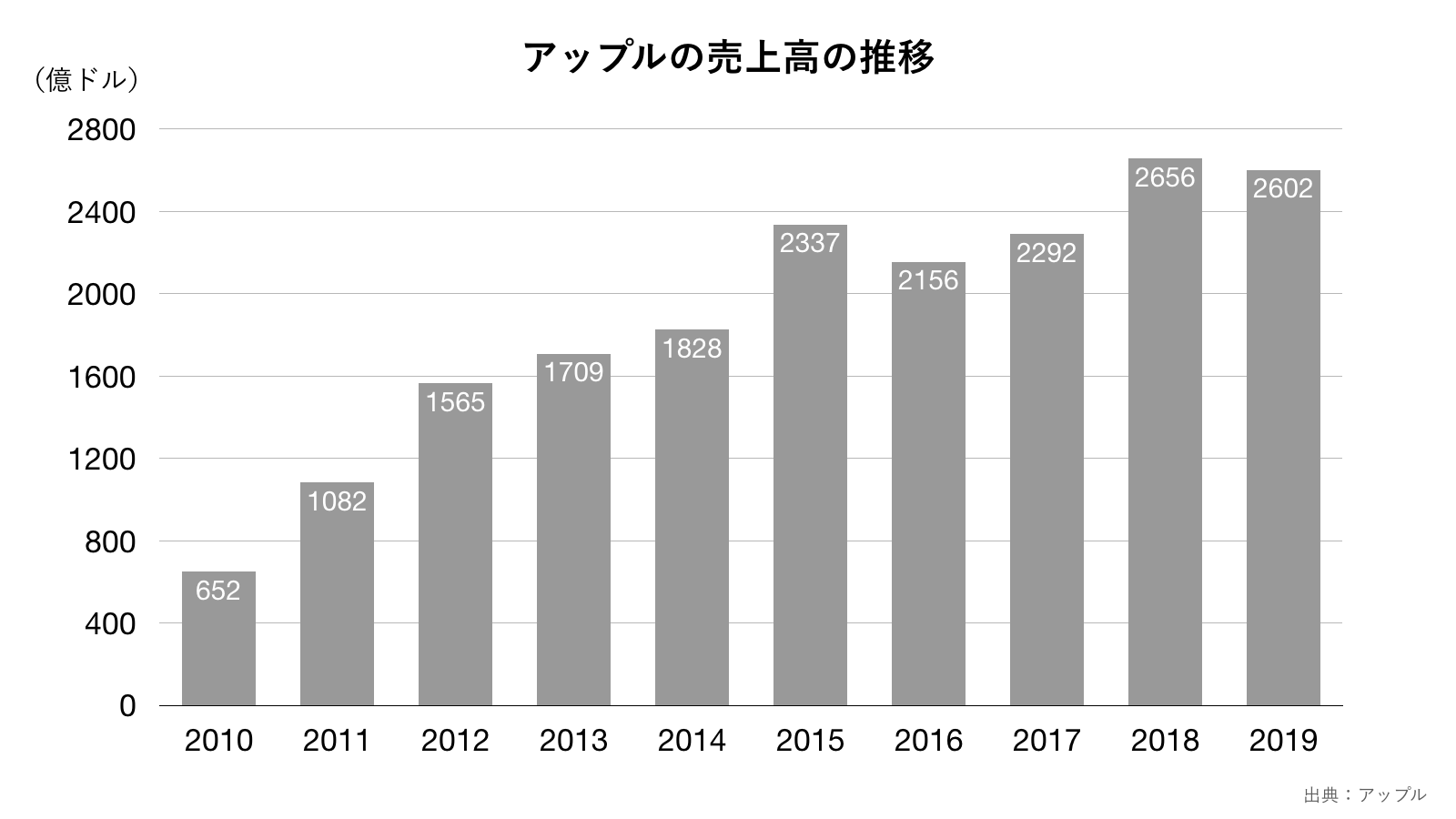 アップルは2019年10月30日に決算を発表し、19年9月期の通期の売上高は2601億ドル。前年に比べてわずかに減少した。また、純利益も前年比7.2%減の552億ドルと、減収減益に終わった。