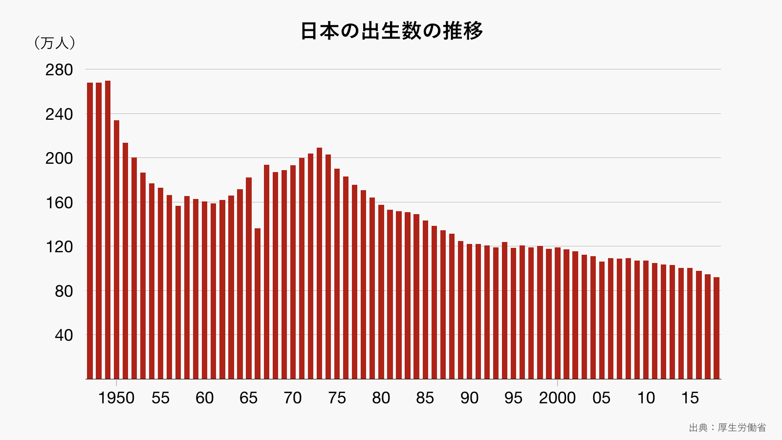 グラフ 日本の出生数の推移のグラフ(長期) 日本の出生数の推移を長期で見ると、団塊の世代が生まれた戦争直後の第一次ベビーブーム、1971年から1974年にかけての第二次ベビーブームのころに200万人の大台を上回ったが、1970年代中盤以降は減少を続けている。2019年6月発表の最新の人口動態統計によると、2018年の出生数は約91万8400人で過去最低を更新した。 公開:2019.06.10 出典:厚生労働省 人口出生数日本社会社会課題 参考図書 人口で語る世界史 Amazon 楽天市場