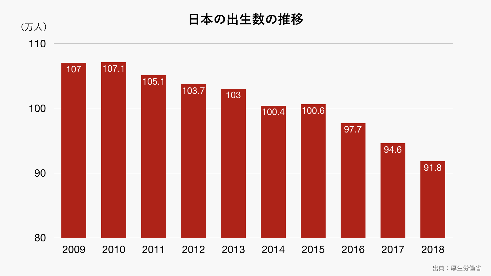 グラフ 日本の出生数の推移のグラフ 厚生労働省が2019年6月7日に発表した人口動態統計によると、2018年の出生数は約91万8400人で過去最低を更新した。2016年に100万人を切って以来、急速に低下している。 公開:2019.06.10 出典:厚生労働省 人口出生数日本社会社会課題 参考図書 人口で語る世界史 Amazon 楽天市場