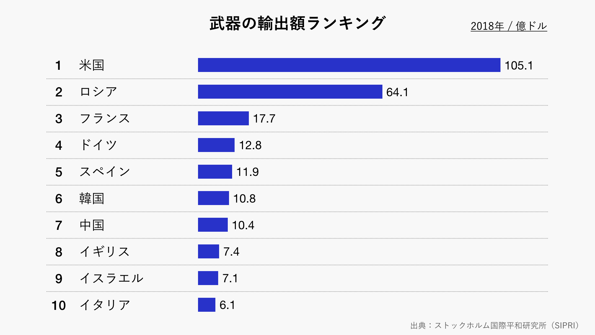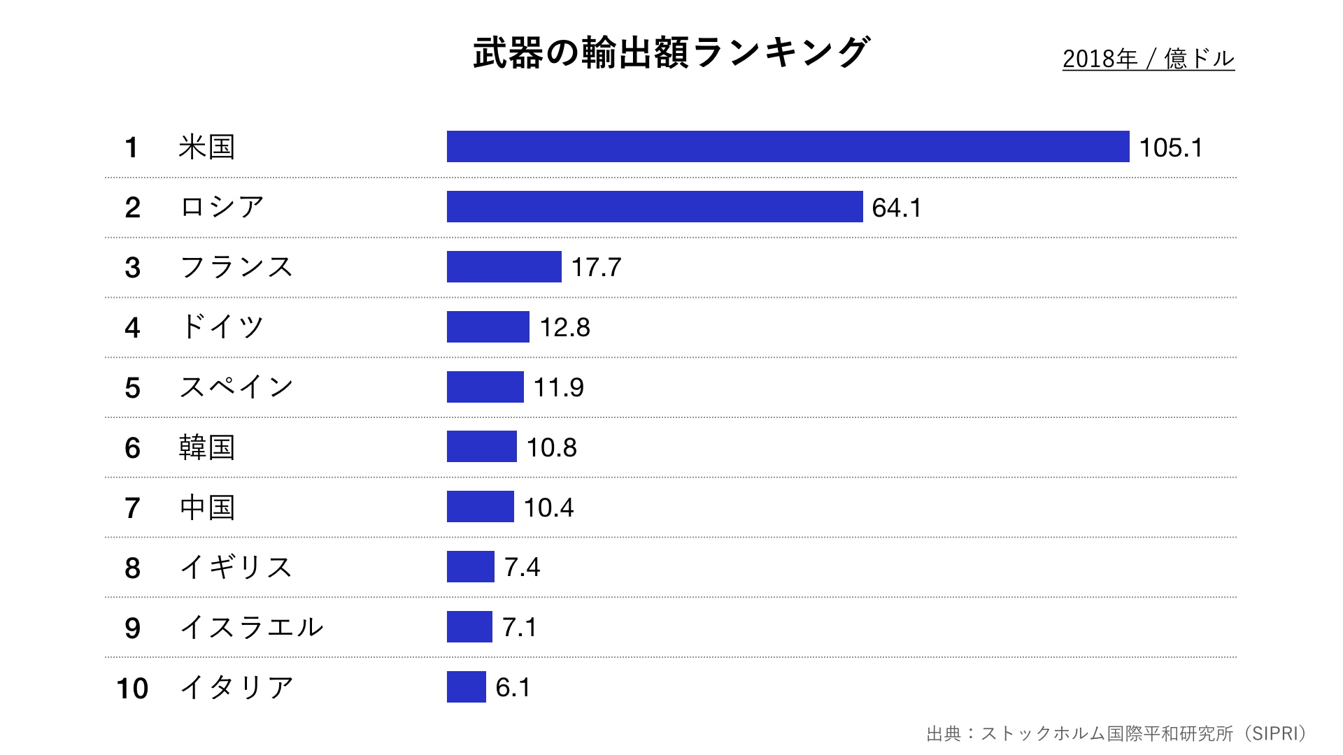 ランキング 武器の輸出額ランキングの図表 スウェーデンのストックホルム国際平和研究所が2019年3月に発表した報告書によれば、世界一の武器輸出国であるアメリカの輸出額は100億ドルを超えており、他国を圧倒している。 公開:2019.03.11 出典:ストックホルム国際平和研究所 国際政治軍事 参考図書 軍備と影響力 核兵器と駆け引きの論理 Amazon 楽天市場