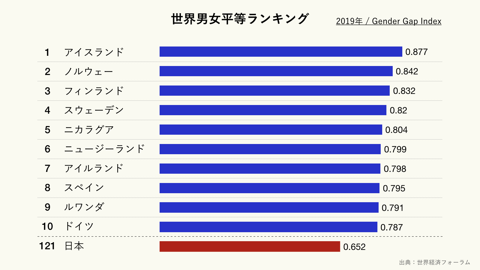 ランキング 世界男女平等ランキング 世界経済フォーラムは2019年12月16日、毎年発表している「ジェンダーギャップ指数」を発表した。対象は世界153ヵ国で日本は昨年の110位から順位を下げ、過去最低の121位となった。 公開:2019.12.20 出典:世界経済フォーラム SDGsジェンダーランキング男女平等 参考図書 図表でみる男女格差 OECDジェンダー白書 2 今なお蔓延る不平等に終止符を! Amazon 楽天市場
